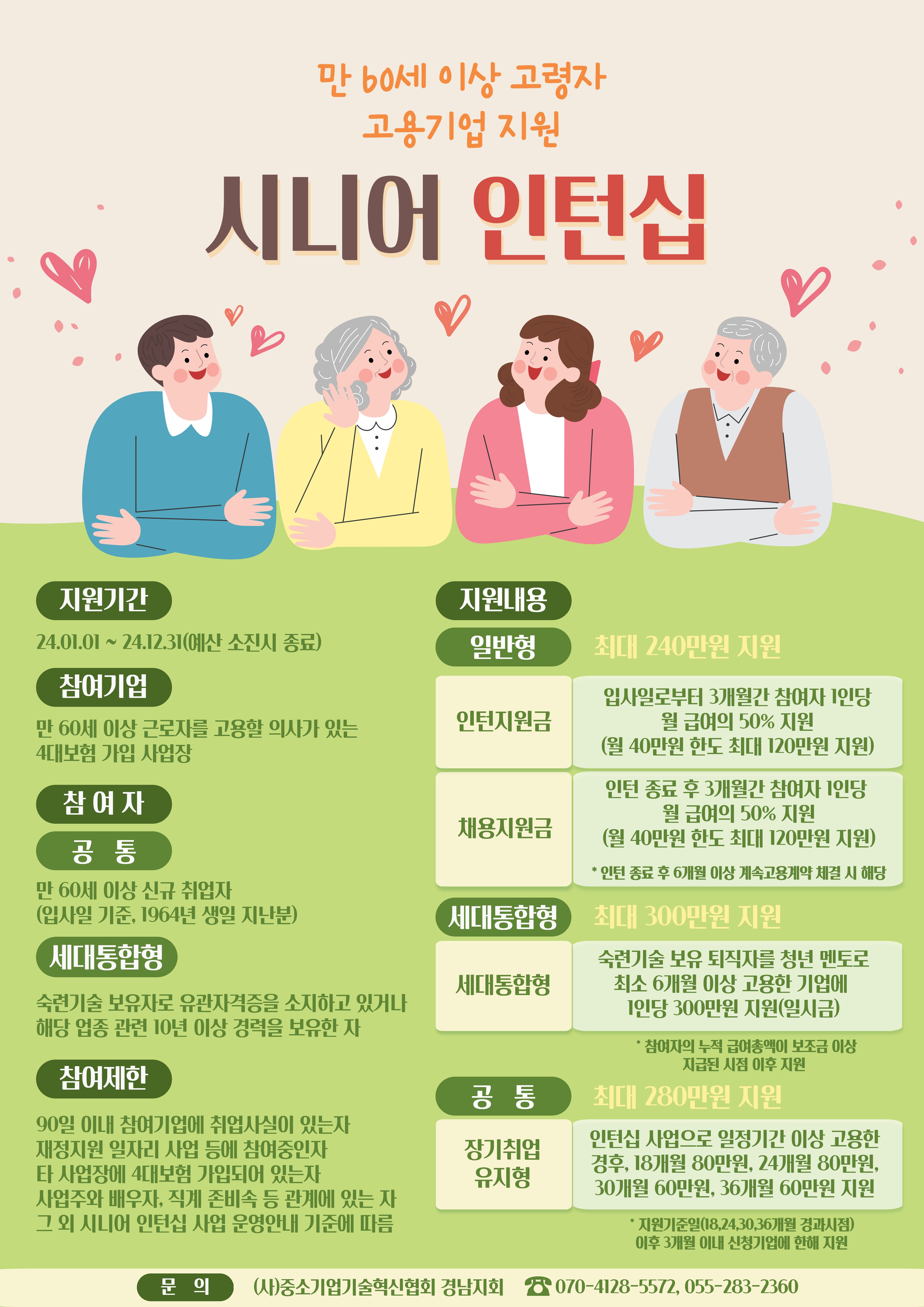 시니어 인턴십은 50대 이상의 경력자들에게 새로운 도전과 성장의 기회를 제공합니다. 풍부한 경험과 열정을 가진 시니어들은 이를 통해 자신의 가치를 재확인하고, 사회에 기여할 수 있는 새로운 방법을 찾을 수 있습니다. 시니어 인턴십 지원을 통해 여러분의 경력에 새로운 장을 열어보세요. 나이는 단지 숫자일 뿐, 여러분의 경험과 지혜는 어떤 직장에서도 귀중한 자산이 될 것입니다.