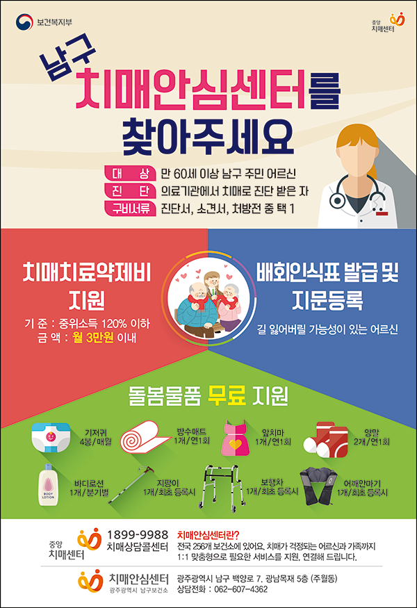 치매 관련 정보 제공, 치매 환자 등록 관리, 맞춤형 서비스 연계 등 기본적인 상담을 제공합니다. 치매 환자로 등록되면 지속적인 관리와 지원을 받을 수 있습니다.