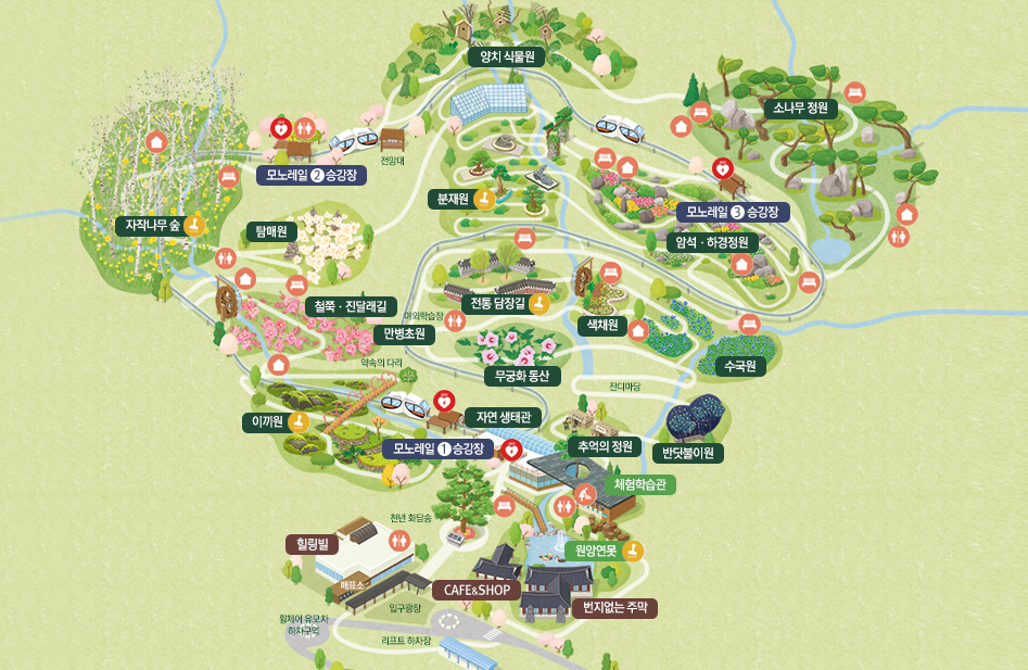 화담숲 모노레일은 총 3개의 승강장을 운영하고 있습니다. 각 노선별로 특징이 있어 여러분의 취향과 시간에 맞춰 선택할 수 있어요.
