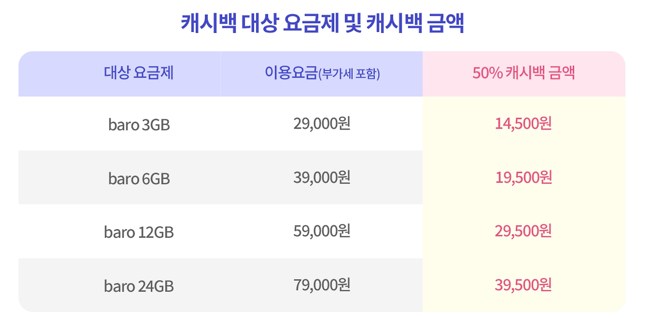 - baro 요금제 이용 시 50% 캐시백 제공