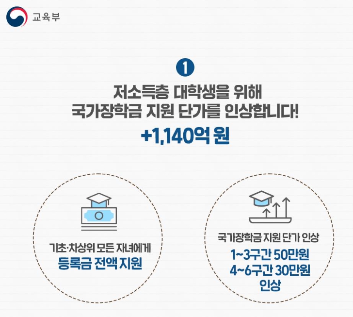 - 대학생 국가장학금 우선 지원: 소득분위 상관없이 국가장학금 지원