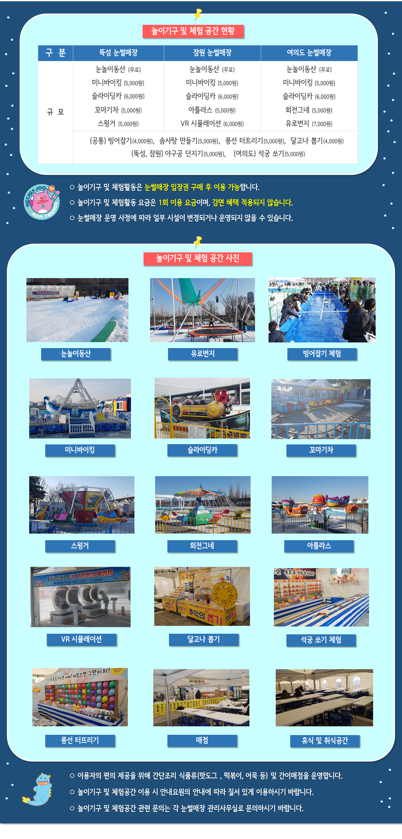 여의도 한강공원 눈썰매장은 방문객의 편의를 위한 다양한 시설을 제공합니다: