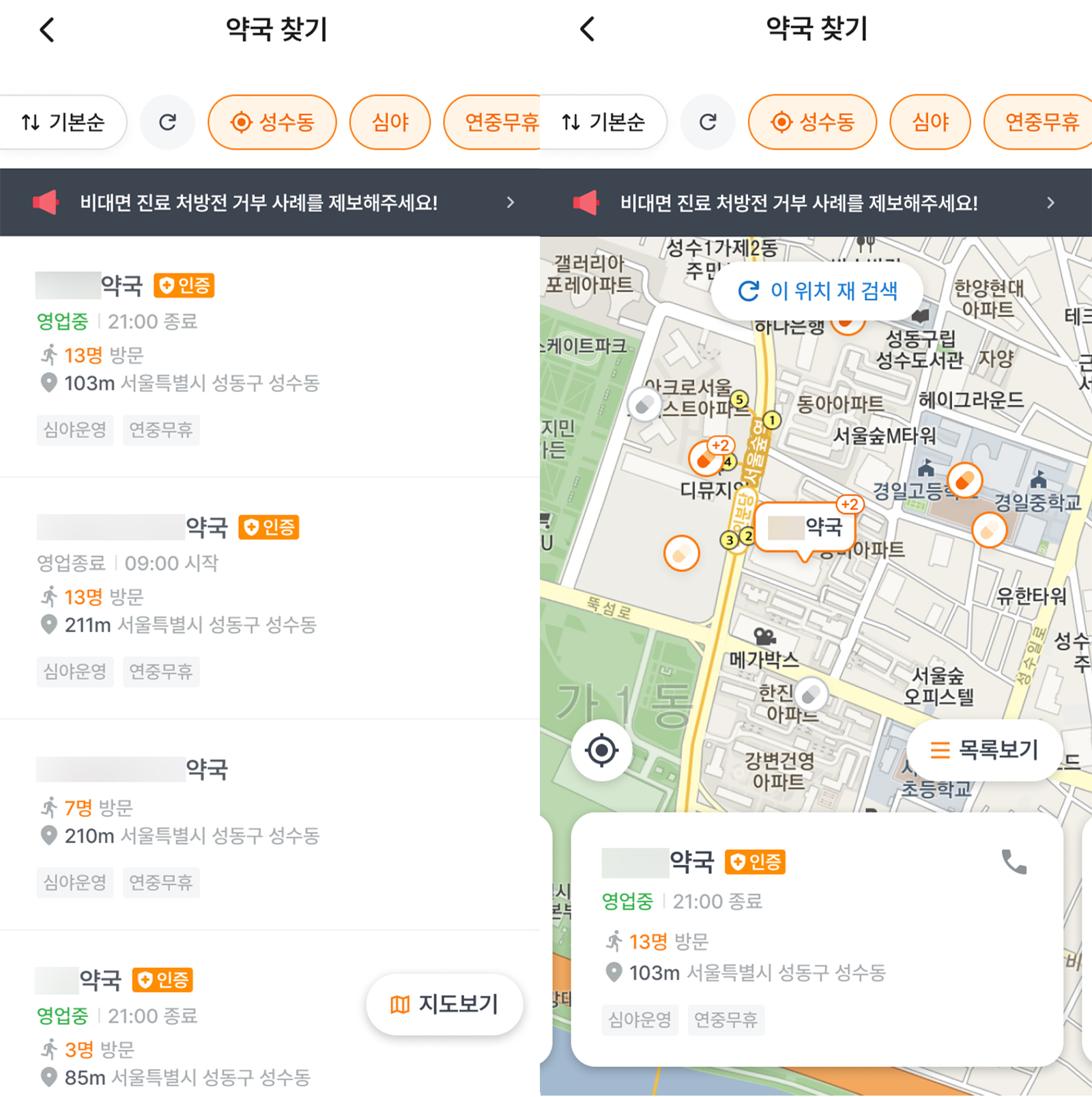 야간 시간(저녁 6시부터 익일 아침 8시까지)에도 운영되는 약국을 실시간으로 검색할 수 있습니다. 이 기능은 갑작스럽게 약이 필요한 상황에서 특히 유용합니다. 일요일과 공휴일 약국 찾기가 어려울 때 이 기능을 활용하면 빠르게 필요한 약을 구할 수 있습니다.