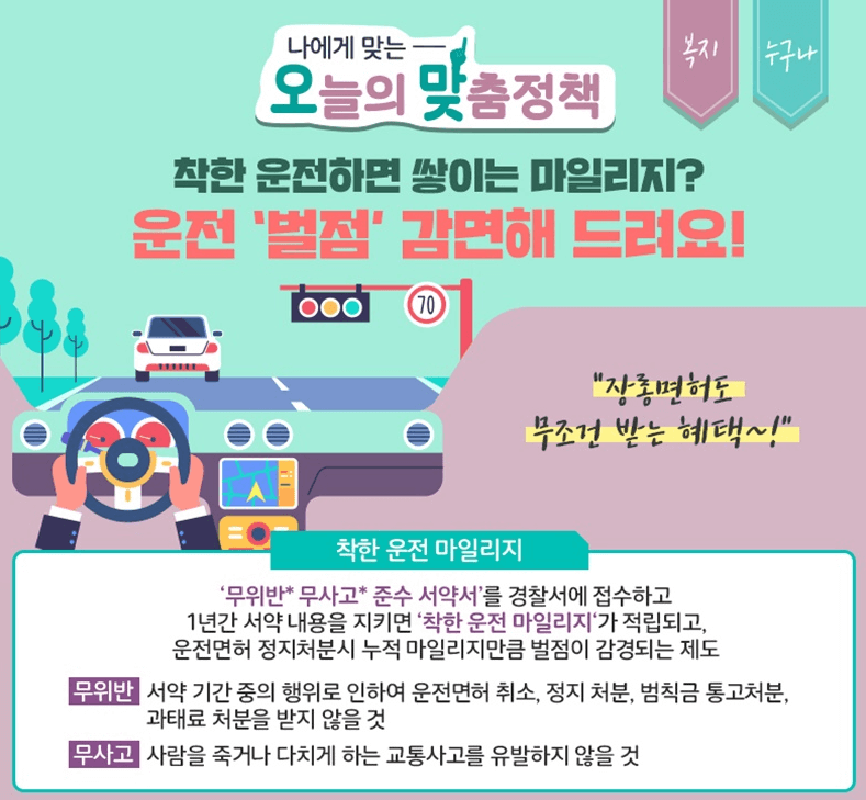 여러분도 지금 바로 착한운전 마일리지에 참여해보세요. 안전한 도로 환경 조성에 동참하면서 개인적인 혜택도 누릴 수 있는 좋은 기회입니다. 착한운전 마일리지로 더 안전하고 즐거운 운전 문화를 만들어갑시다!