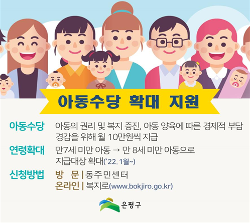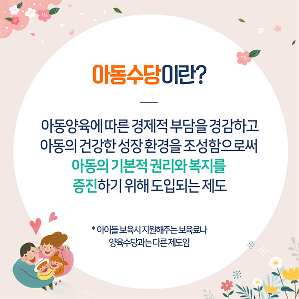 아동수당은 아이를 키우는 가정의 경제적 부담을 덜어주고, 아이들이 건강하게 자랄 수 있는 환경을 만들기 위해 국가가 지원하는 복지제도입니다. 2018년 처음 도입된 이후 지속적으로 확대되어 현재는 8세 미만 모든 아동이 혜택을 받을 수 있습니다.