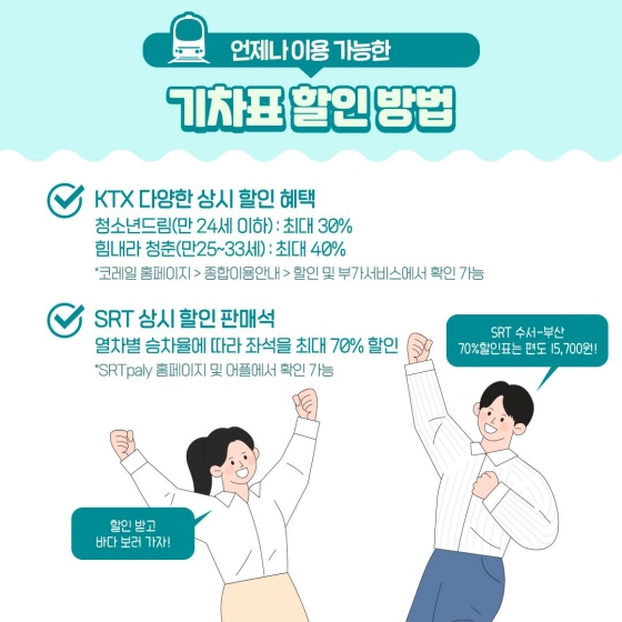 여행 비수기에는 코레일에서 특별 할인 이벤트를 진행합니다. 주로 1~2월, 7월 중순, 11월에 파격적인 할인이 제공됩니다.